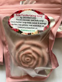Cocoa and shea butter soap base, shea butter, cocoa butter, mango butter, jojoba oil, rose essential oil, rose petals (note: some bars don't contain rose petals).